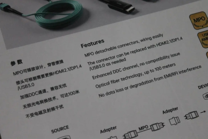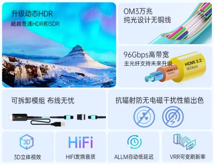 这是一款纯光纤HDMI线,12芯OM3万兆光纤可以实现100米的超长无损信号传输,8K60Hz无压力。