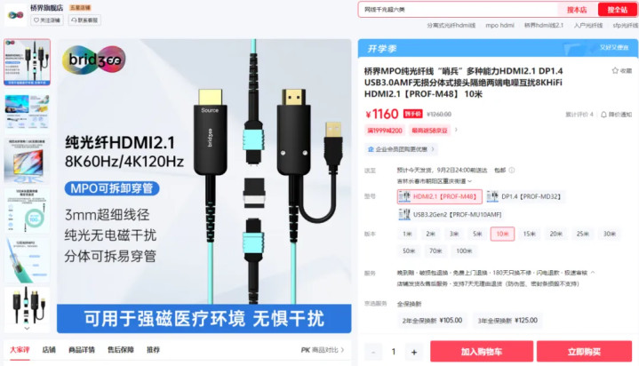 它就是桥界PROF-M系列纯光HDMI线,10米非钢甲版京东售价一千出头,比Mark系列便宜些。