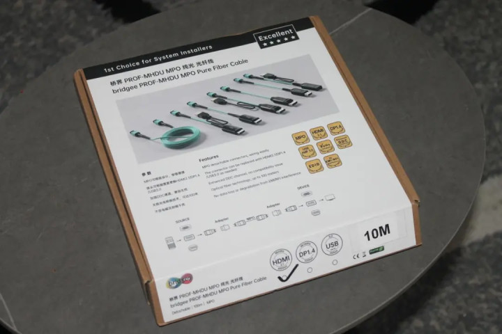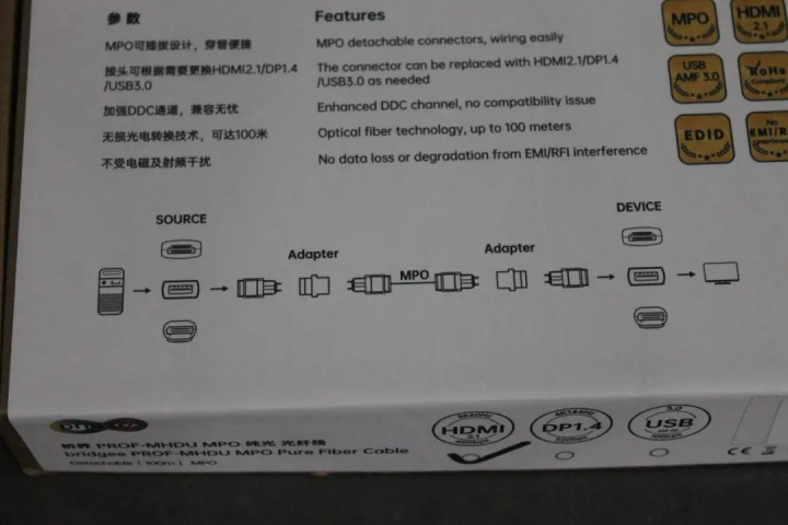 优点都印在盒子上了,主要就是超级无敌抗干扰、功能扩展性强,可以更换DP头、USB头等,方便穿线、换线、换插头。