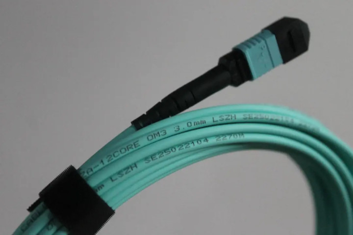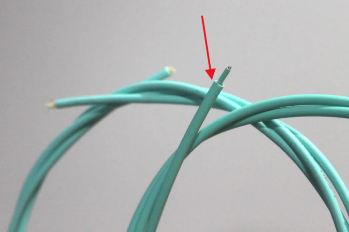水蓝色低烟无卤外皮,触感光滑,略微偏硬。里面除了12根光纤,还有抗拉纤维,线径只有3mm,装修预埋时候穿线就变得非常容易,也不容易把光纤扯断。